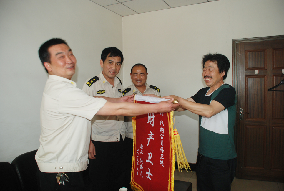 保衛處加強廠區內部治安管理工作,為軋鋼廠職工XXX查找回丟失財物。圖為該職工向保衛處贈送錦旗。